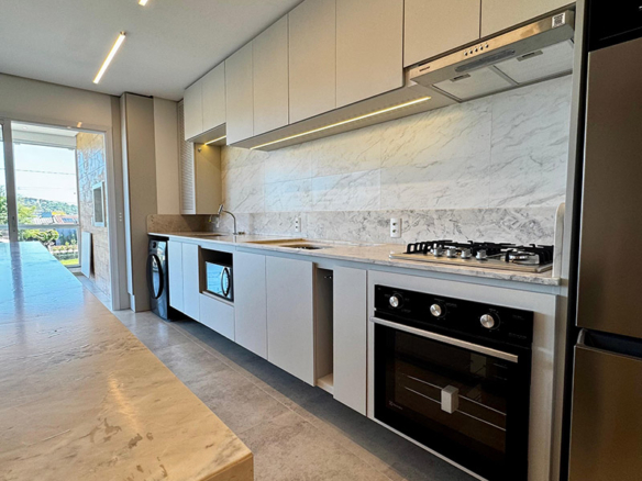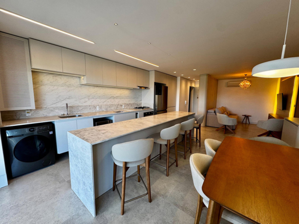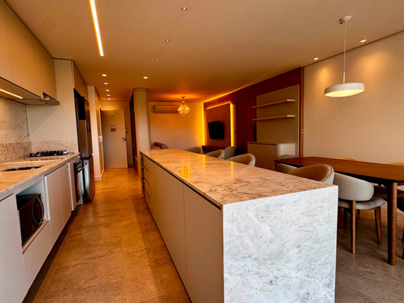 Na cozinha, a ampla ilha em mármore se torna o ponto de encontro da casa: prática, funcional e perfeita para receber. A integração com a área social proporciona fluidez, enquanto a marcenaria sob medida garante organização e sofisticação.