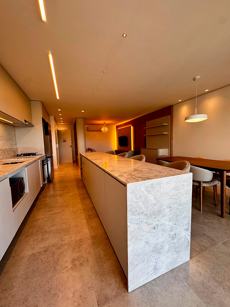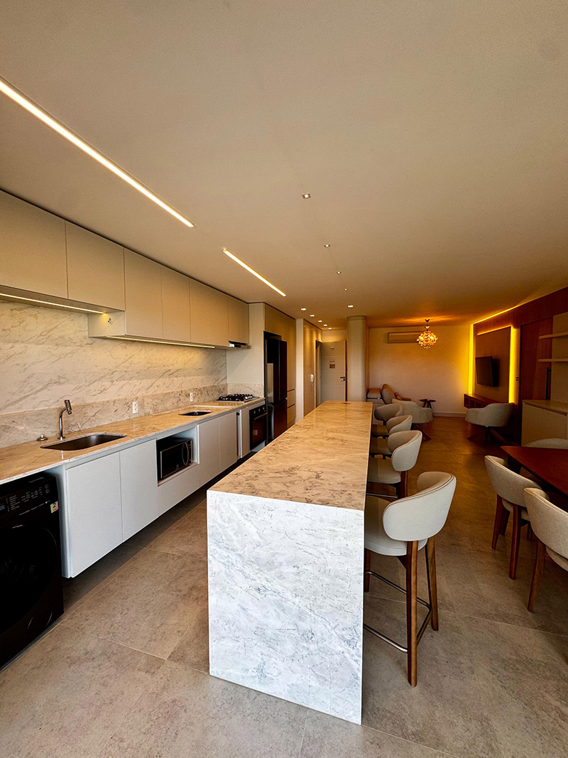 O Apartamento Dolce Vita foi projetado para unir elegância, conforto e funcionalidade em cada detalhe. A paleta neutra, marcada pela combinação do mármore, madeira e tons claros, cria uma atmosfera acolhedora e ao mesmo tempo sofisticada, refletindo o verdadeiro estilo contemporâneo.
