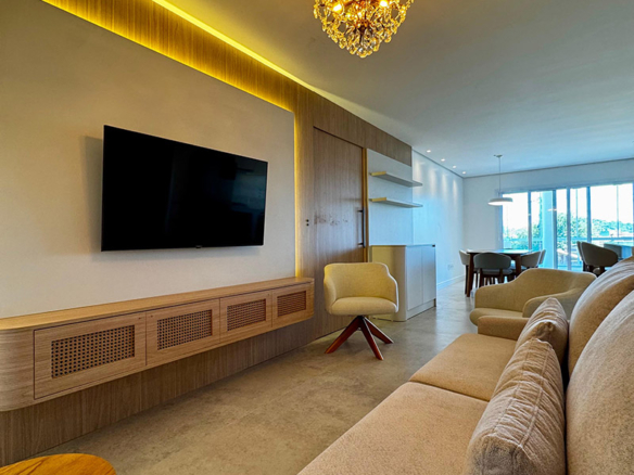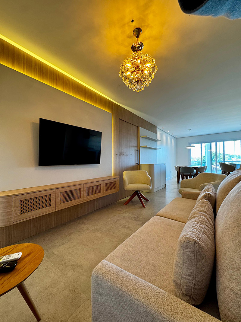 Na sala, o painel em madeira iluminado por fitas de LED realça a atmosfera aconchegante, e o mobiliário em linhas suaves traduz a busca por conforto sem abrir mão do design. O lustre em cristais traz um toque de brilho e exclusividade ao espaço.